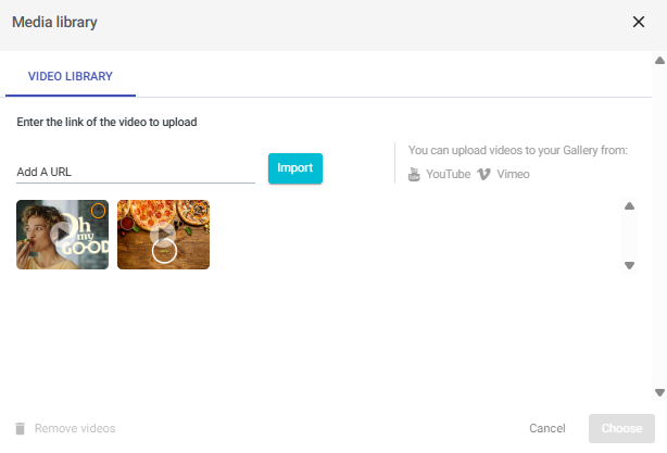 If you already have the video added to your library, select it and click on Choose. If the video hasn't been added to your library, you can paste the link to the video in the "Add a URL" field. Note: You can upload videos from YouTube or Vimeo.