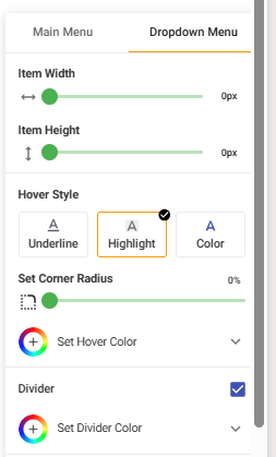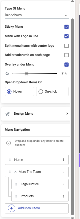- Open dropdown items on: Choose how your dropdowns activate. Set them to open on Hover for faster navigation or on Click for more deliberate interaction.
