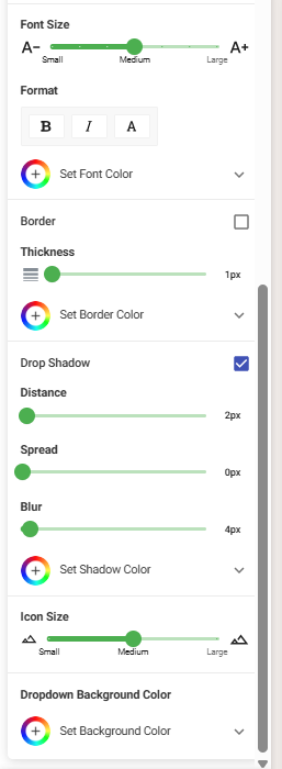 - Background & Icons: Set the Dropdown Background Color and adjust the Icon Size.