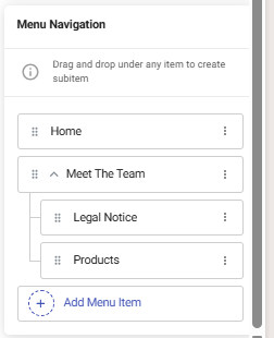 - Reordering Items: You can easily change the order of your menu items. Simply click and hold the six dots (⋮⋮), then drag it to your preferred position and drop it. You can even drag one item onto another to instantly create a dropdown menu.