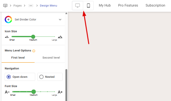 In mobile mode, you can also customize the style of each menu level. To toggle Mobile Mode, click on the icon at the top of the editor.