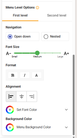 Choose between the first or second level and customize the look of the menu including Font Size, Format, Alignment, and font and background color.